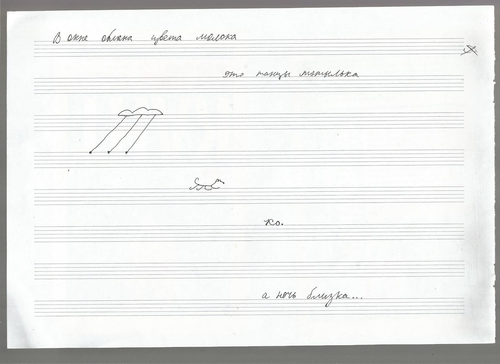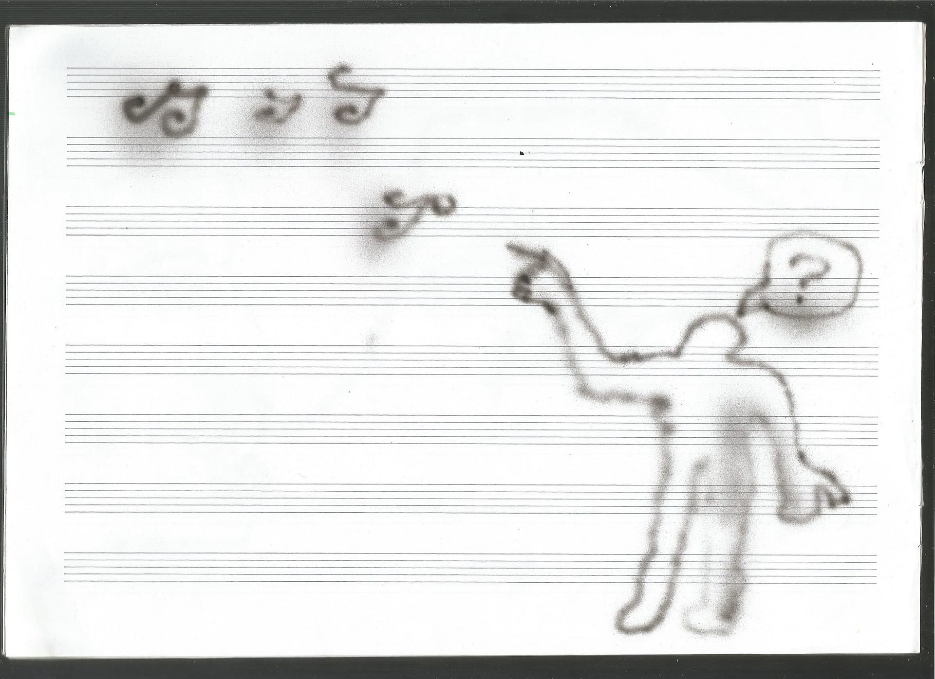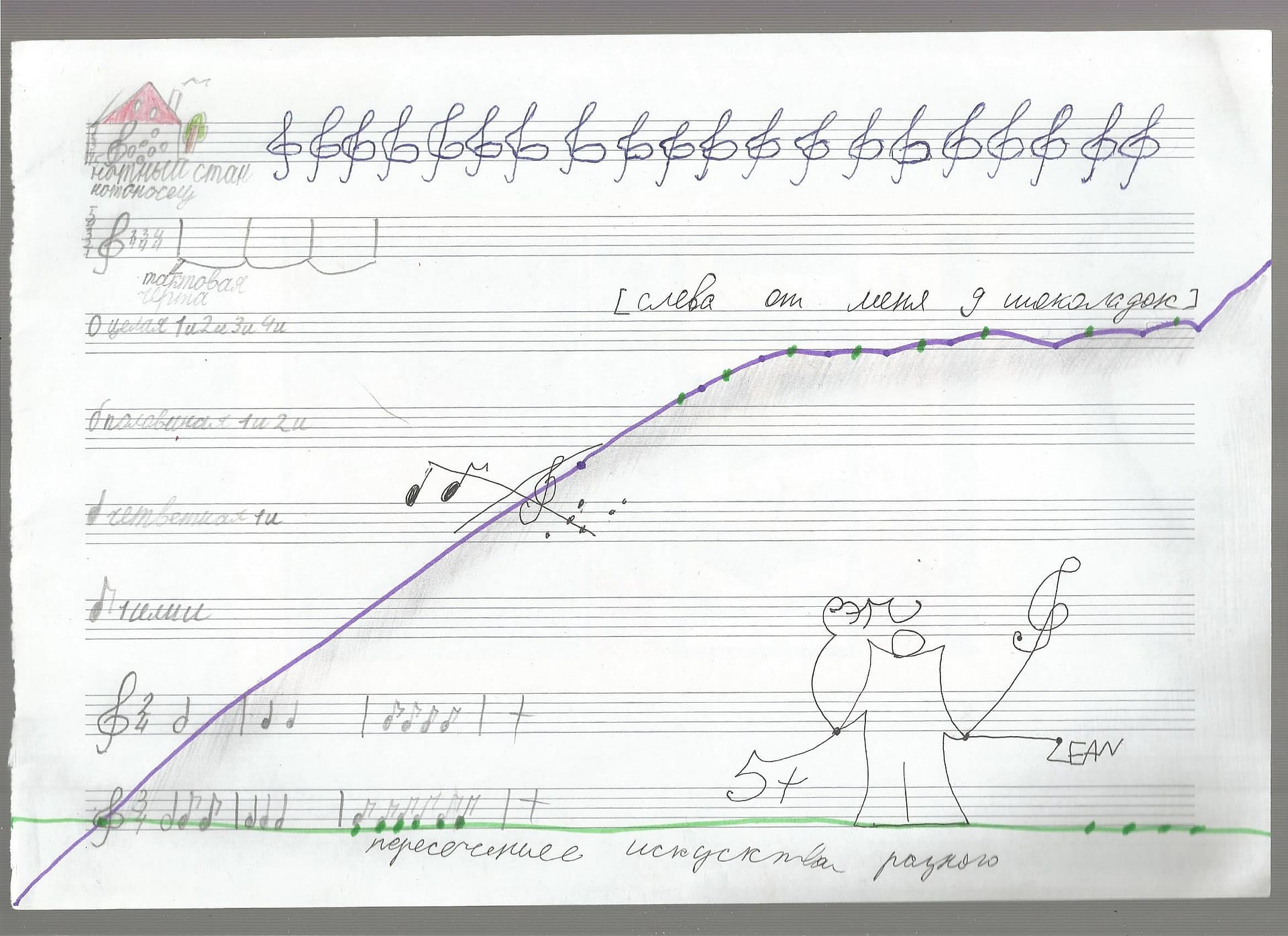 Серия работ 17 летнего художника Zean Zack’а запечатлевает экспрессивные меланхолические образы, будто взятые из пугающе красивого сна, настигающего человека на пике эмоционального перелома. Смесь теплых воспоминаний и странных персонажей неравномерно заполняет пространство нотной бумаги, сохранившейся со школьных уроков музыки, и оставляет после себя нервные каракули на листе, призванном упорядочить и выстроить музыкальную композицию. Среди всех работ можно выделить три отдельные, где подростковый бунт, принуждающий сопротивляться «властному» документу-листу смиряется. Карикатурные изображения на себя и на окружающих людей, заполняющие лист выстроенной нотной сетки, сменяются ритмичными композициями, где каракули уже сами создают мелодию и перерастают в очень наивный и игрушечный Gesamtkunstwerk*, который, всё же, так и не вырастает во что-то большее, чем обычные «музыкально» — испорченные школьные заметки. *