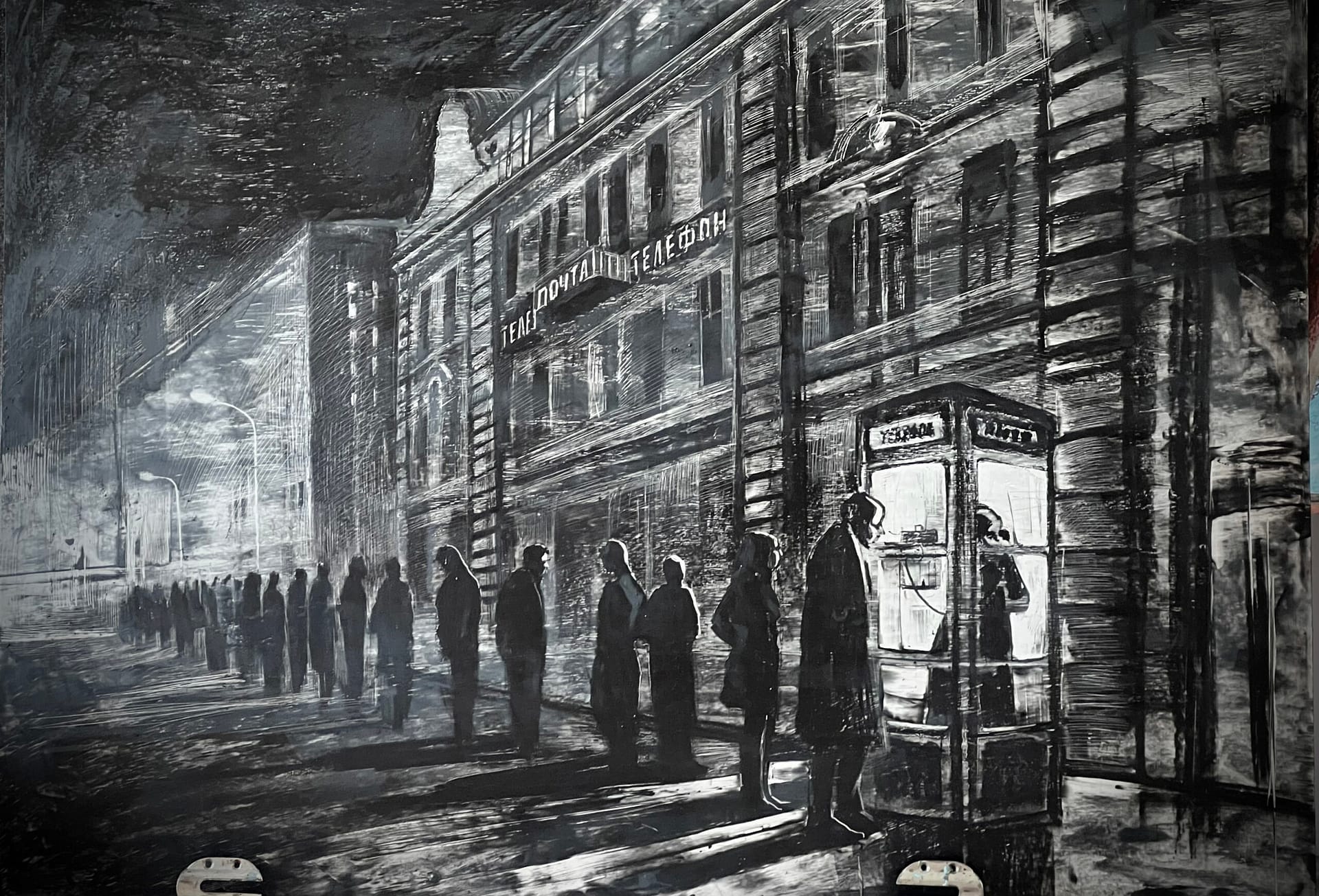 Очередь— это образ коллективного ожидания, символизирующий стремление советского человека к приватности и доступу к информации.