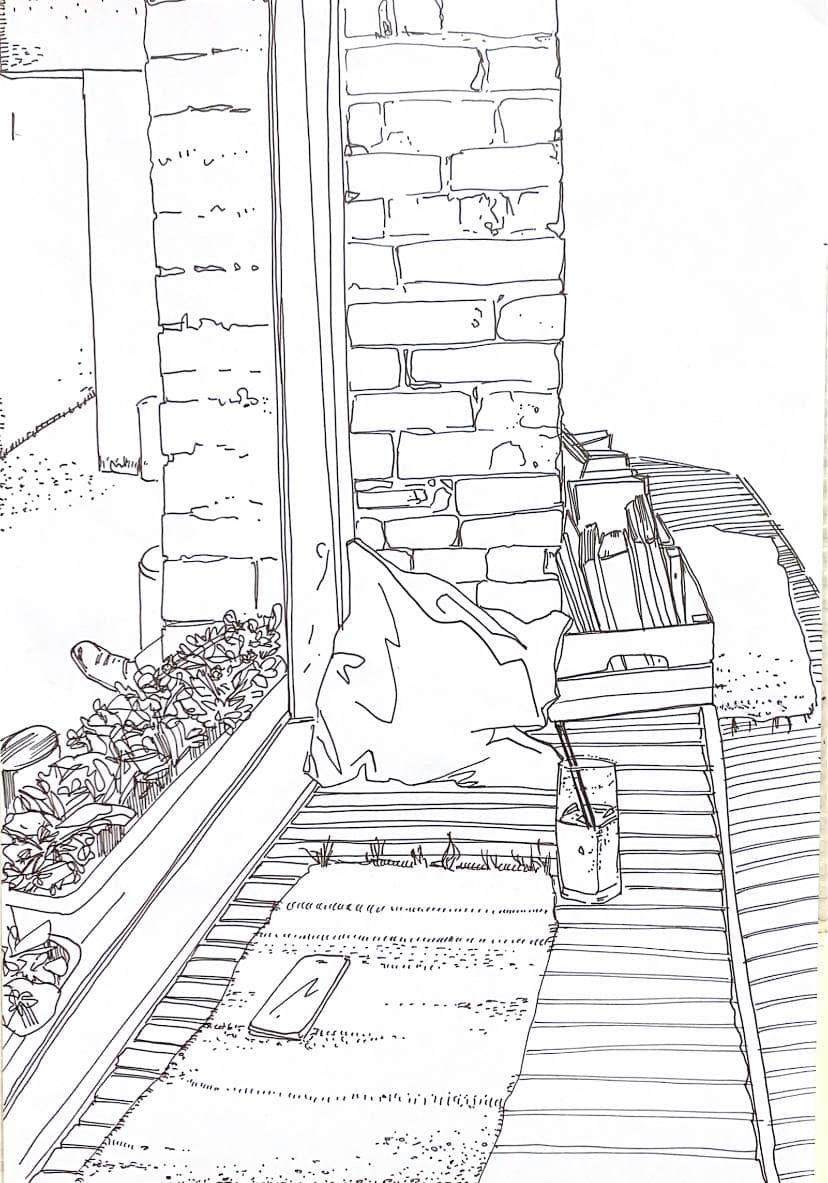 Инсталляция Кати Забелиной представляет собой синтез чувственной телесности и точечной фиксации наблюдателя, что подчеркивается разницей материалов и техник. Ее графика это случайные зарисовки пространства культурного центра, которые являются быстрой фиксацией беглого взгляда посетителя/художника. Эту практику Катя описывает как попытку документации своих ощущений пространства, которое в дневной момент имеет четкие границы, но с началом первой же вечеринки теряет образность и трансформируется. Такой фактической графике противопоставляются работы-панно, которые совсем не стараются зафиксировать ускользающее пространство, а полностью растворяются в общем танцевальном потоке. Эти коомпозиции на ткани, собранные как коллаж из обрывков ярких тусовочных образов и символов, стараются запечатлеть остаточную энергию и эмоциональные моменты пульсирующего пространства вокруг. Примечательно, что «трезвый» взгляд графики чередуется с эмоциональными панно, в которых силуэты танцующих людей превращаются наброски всё того же окружения, но уже не считываются как что-то предметное.